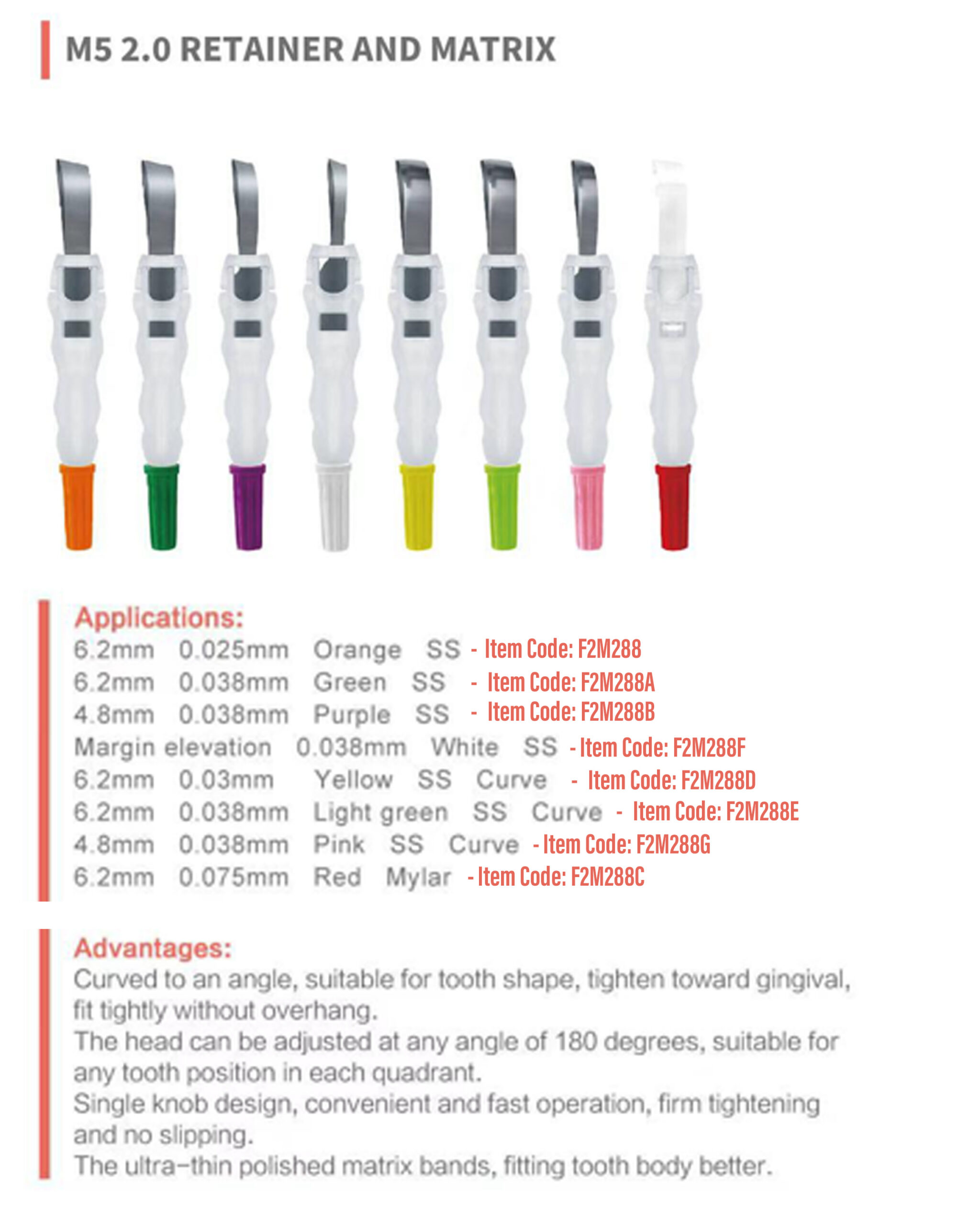 Ready to use, adjustable band. With 180° head rotation and tightening screw at the base. Easily released after restoration without affecting materials.
