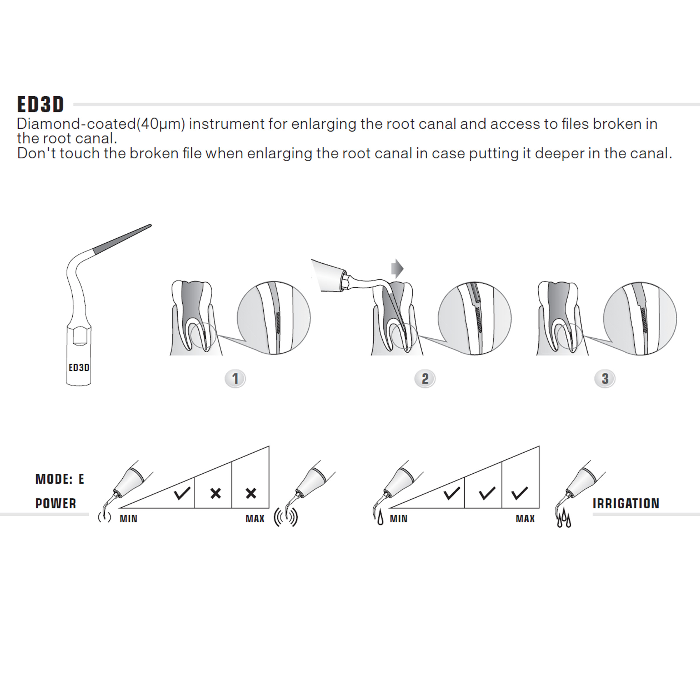 The ED3D ultrasonic tip from DTE compatible for use with DTE, Satelec, & NSK Ultrasonic Scalers. The ED3D has a 40µm diamond coated tip, designed for enlarging the root canal during RCT treatments and for accessing broken instruments in the canal. (The endo tip should not touch the foreign object being retrieved and should be used to work around the object). The tip may be used as a preliminary step during file retrieval. The ED3D angled tip has a 12mm section of Diamond grit coating, with conical tip down to 0.7mm end.