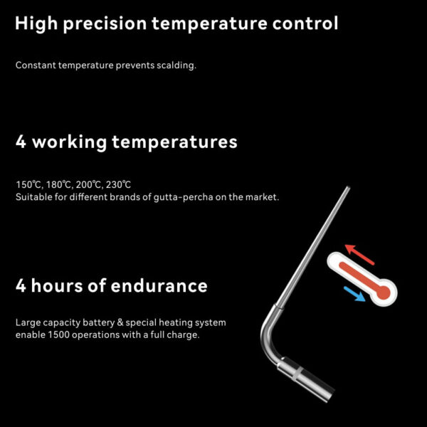 An ergonomic, fast-heating, multi setting obturation plugger.