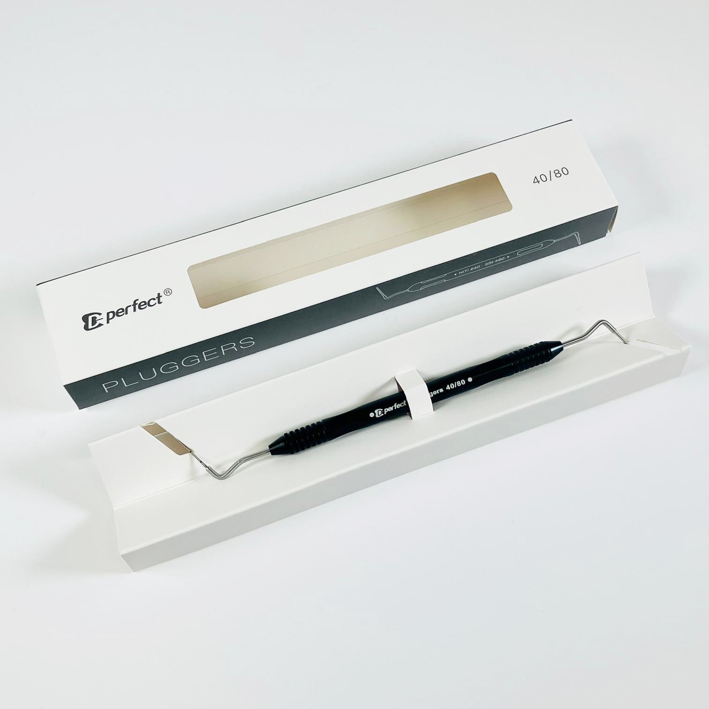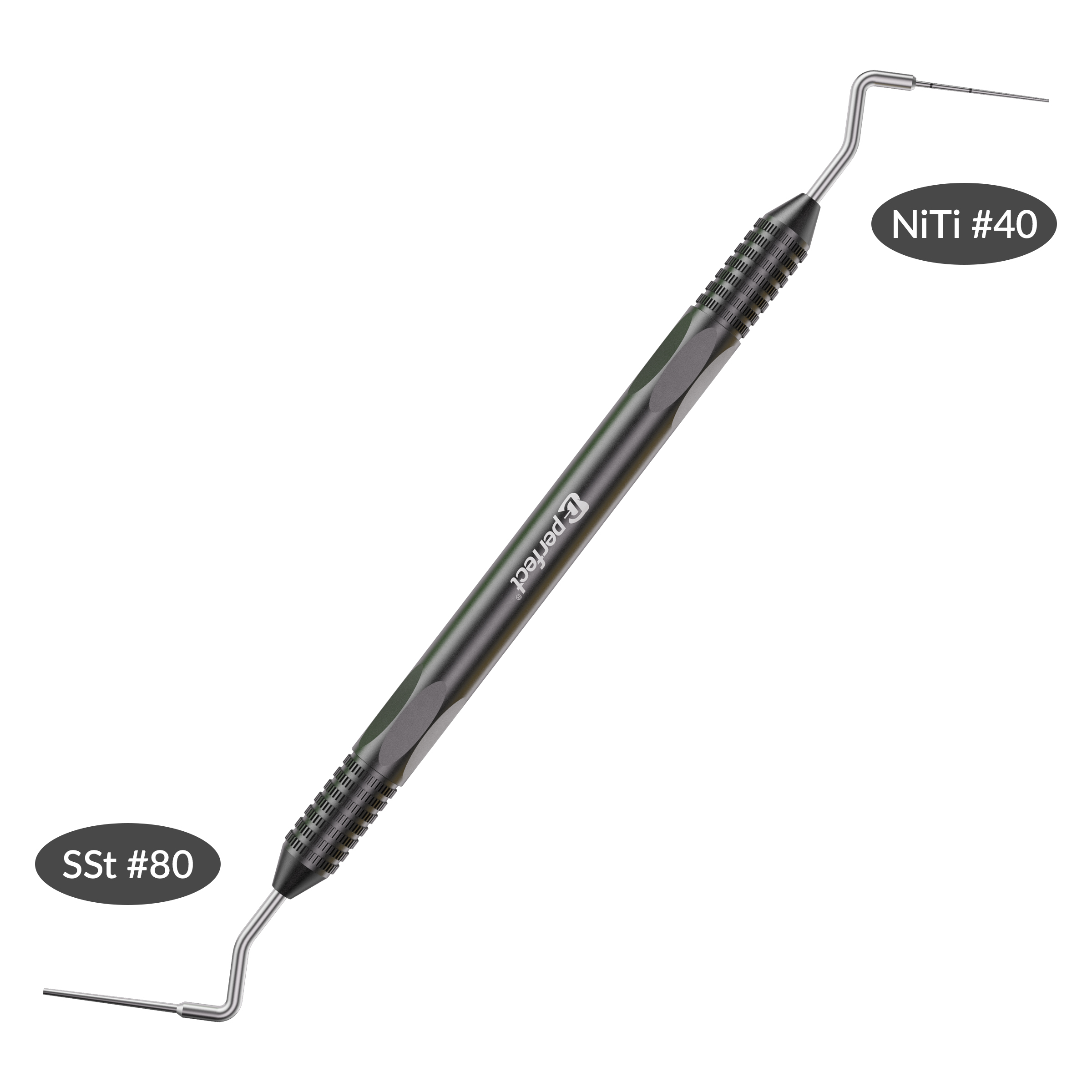 Size #40 NiTi conical tip and Size #80 Stainless Steel flat tip, ideal for both lateral and vertical compaction of gutta-percha.