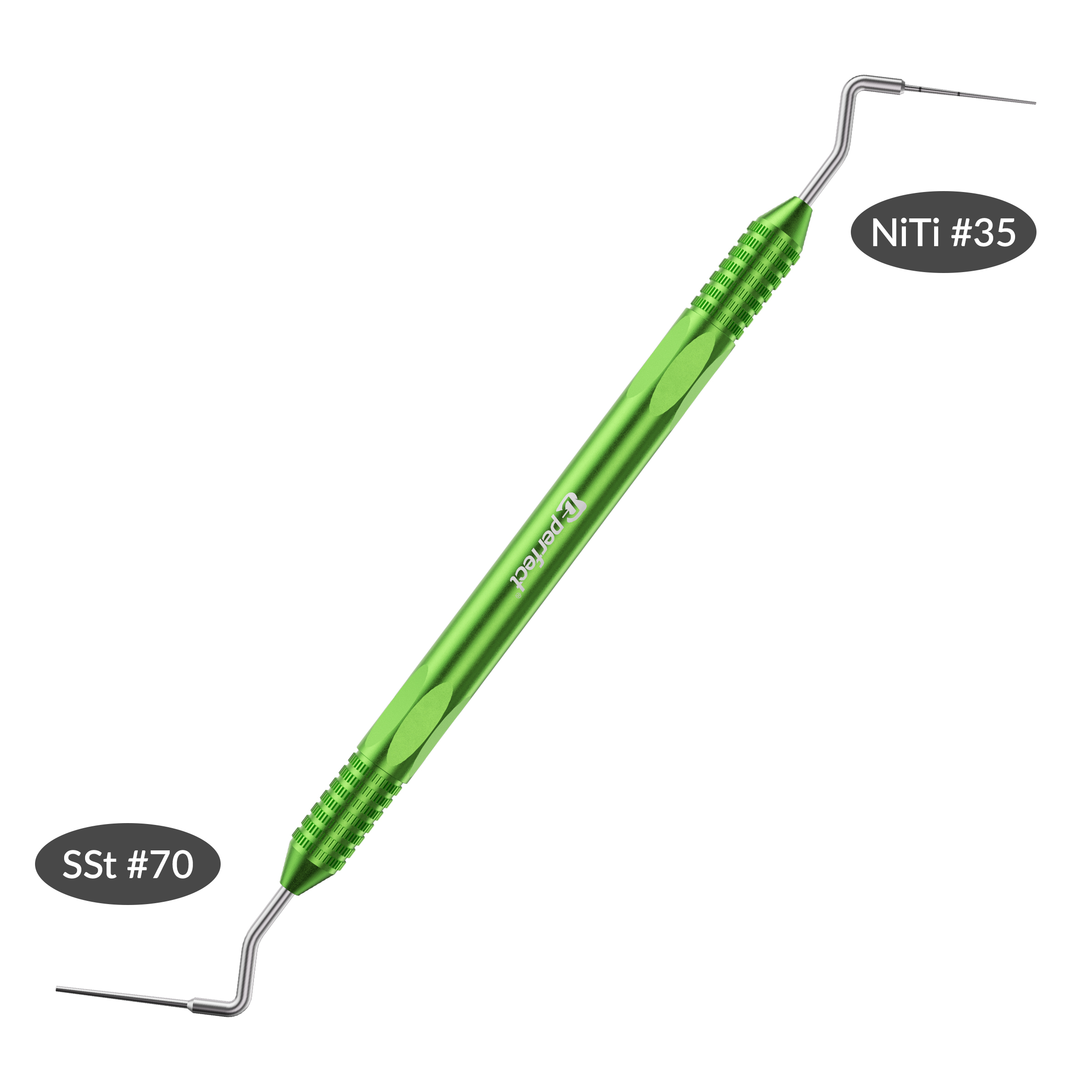 Size #35 NiTi conical tip and Size #70 Stainless Steel flat tip, ideal for both lateral and vertical compaction of gutta-percha.
