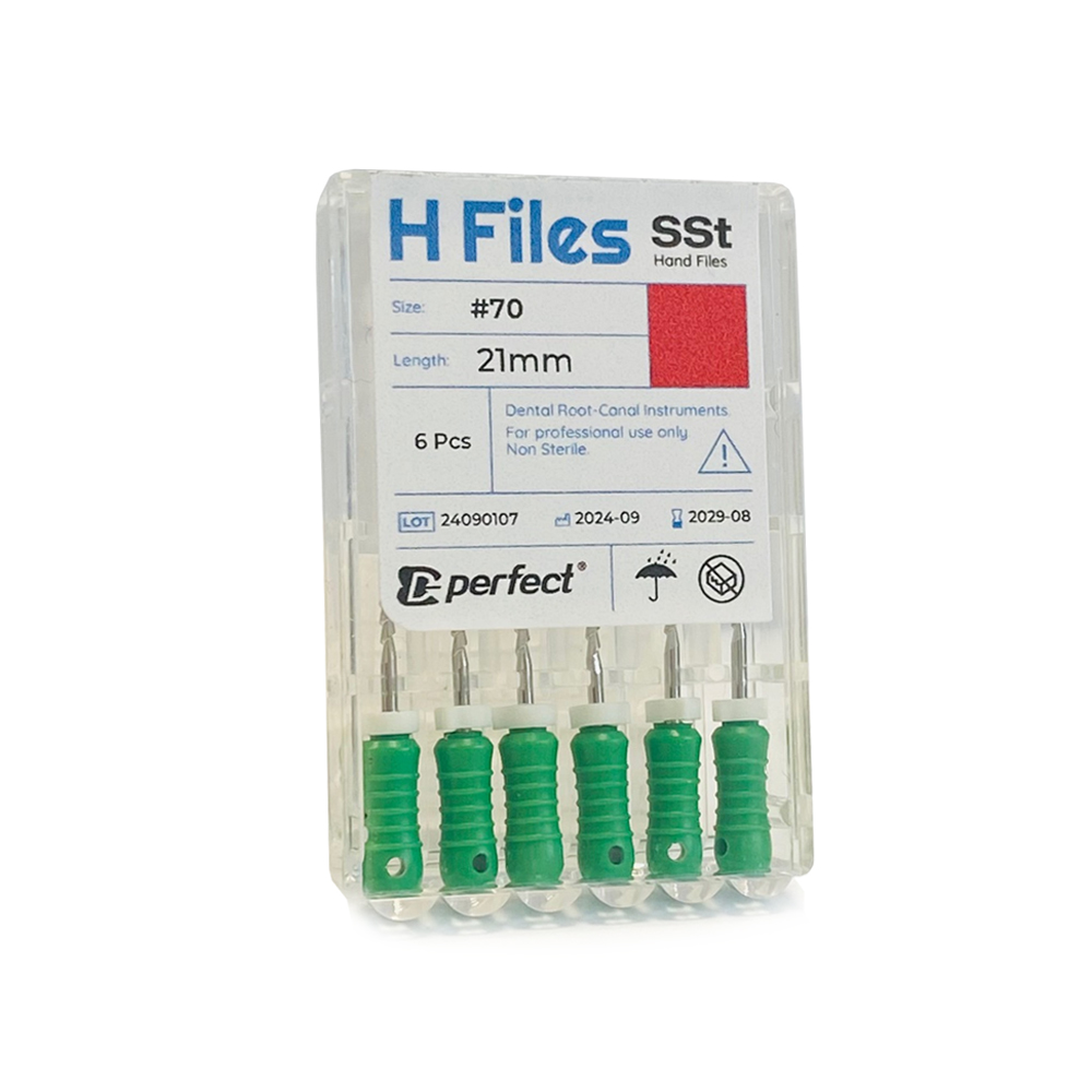 Stainless Steel H-Files (Hedstrom type) from Dental Perfect with ergonomic grip and ISO colour coding.