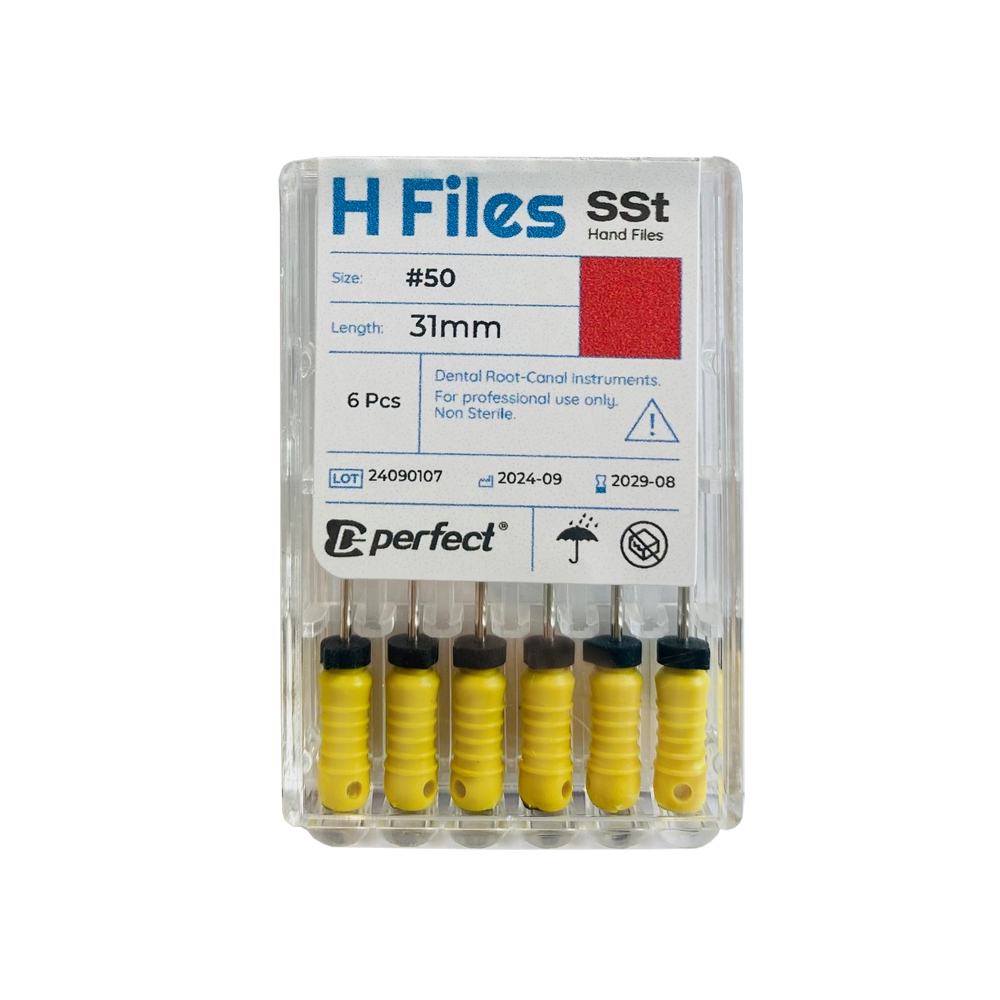 Stainless Steel H-Files (Hedstrom type) from Dental Perfect with ergonomic grip and ISO colour coding.